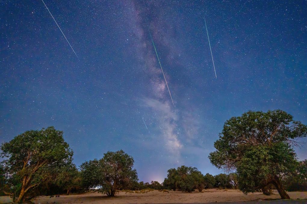 星空摄影师周博2023年8月12日在新疆哈密板房沟拍摄的英仙座流星雨。(星联CSVA供图)