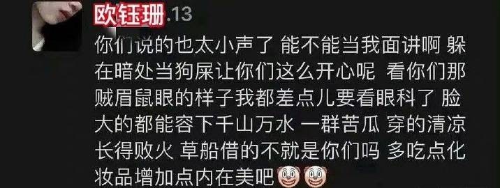 随后,欧钰珊在朋友圈进行反击,怼道:“我这么拉的人都进决赛了,罗欢怎么没进?”随后,她又继续发了很多内容怼罗欢。