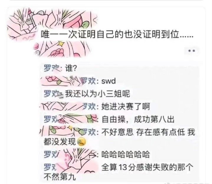 有网友在朋友圈内涵运动员没抓住唯一的一次机会证明自己,罗欢询问谁后被告知是苏炜德,又感叹称以为是“小三姐”,当对方表示“小三姐”进决赛后,两人又在评论区继续讨论,罗欢十分看不起“小三姐”第八的成绩,各种阴阳。