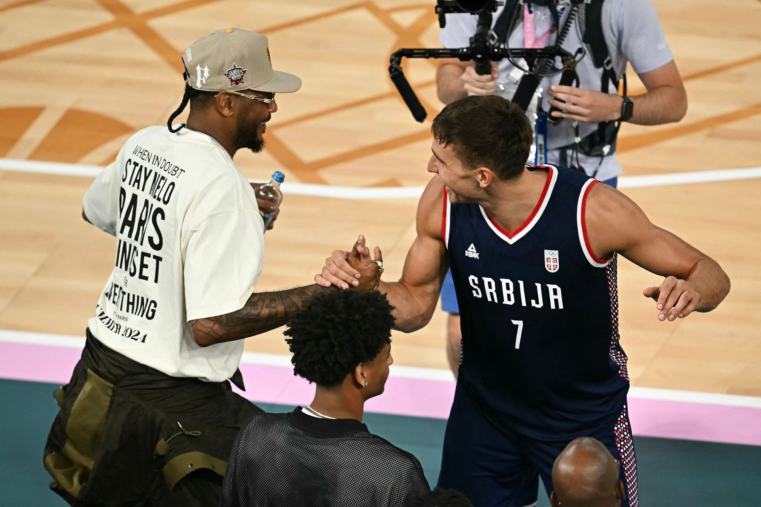 赛后,博格丹来到场边与现场观战的美国篮球名宿安东尼握手并拥抱致意。两人都是国际赛场上的巨星,且有着同款三分庆祝动作。