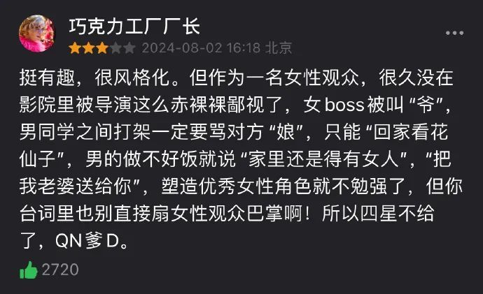 如果说这部电影的有趣令人眼前一亮,那么绝对的男频表达也足够让人眼前一黑。