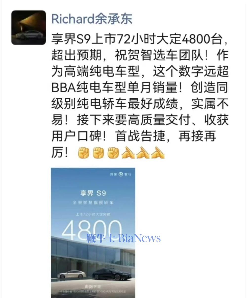余承东表示:“享界S9上市72小时大定4800台,超出预期,祝贺智选车团队!作为高端纯电车型,这个数字远超BBA纯电车型单月销量。”