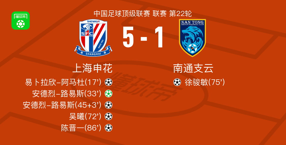 北京时间8月10日上海申花vs南通支云,安德烈-路易斯得到全场最高的9.1分,李华扬得到全场最低的5.4分