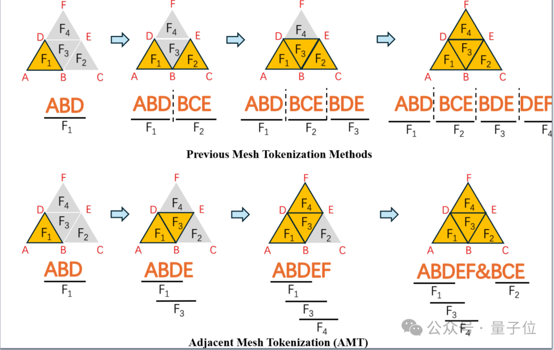 上图清晰地表达出了AMT的运作过程,其通过优先表达相邻的面片来用1个vertex表达一个面片。当不存在相邻的没表达过的面片,AMT添加一个特殊token “&”来标识这一情况并重新开始。