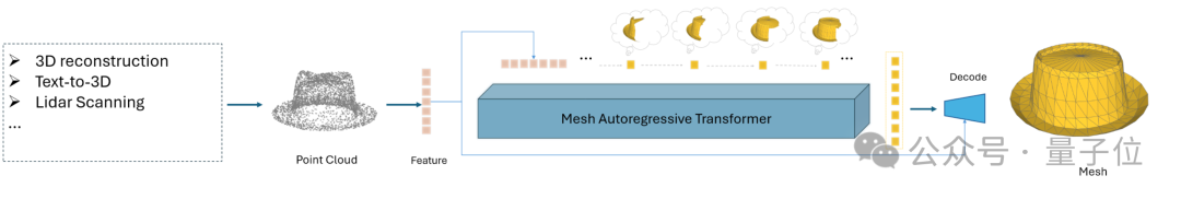 MeshAnything是一个自回归的transformer,其将Mesh的每个面片视作token,整个Mesh被视作token序列,接着像大语言模型一样,一个token一个token地生成,最终生成出整个Mesh。
