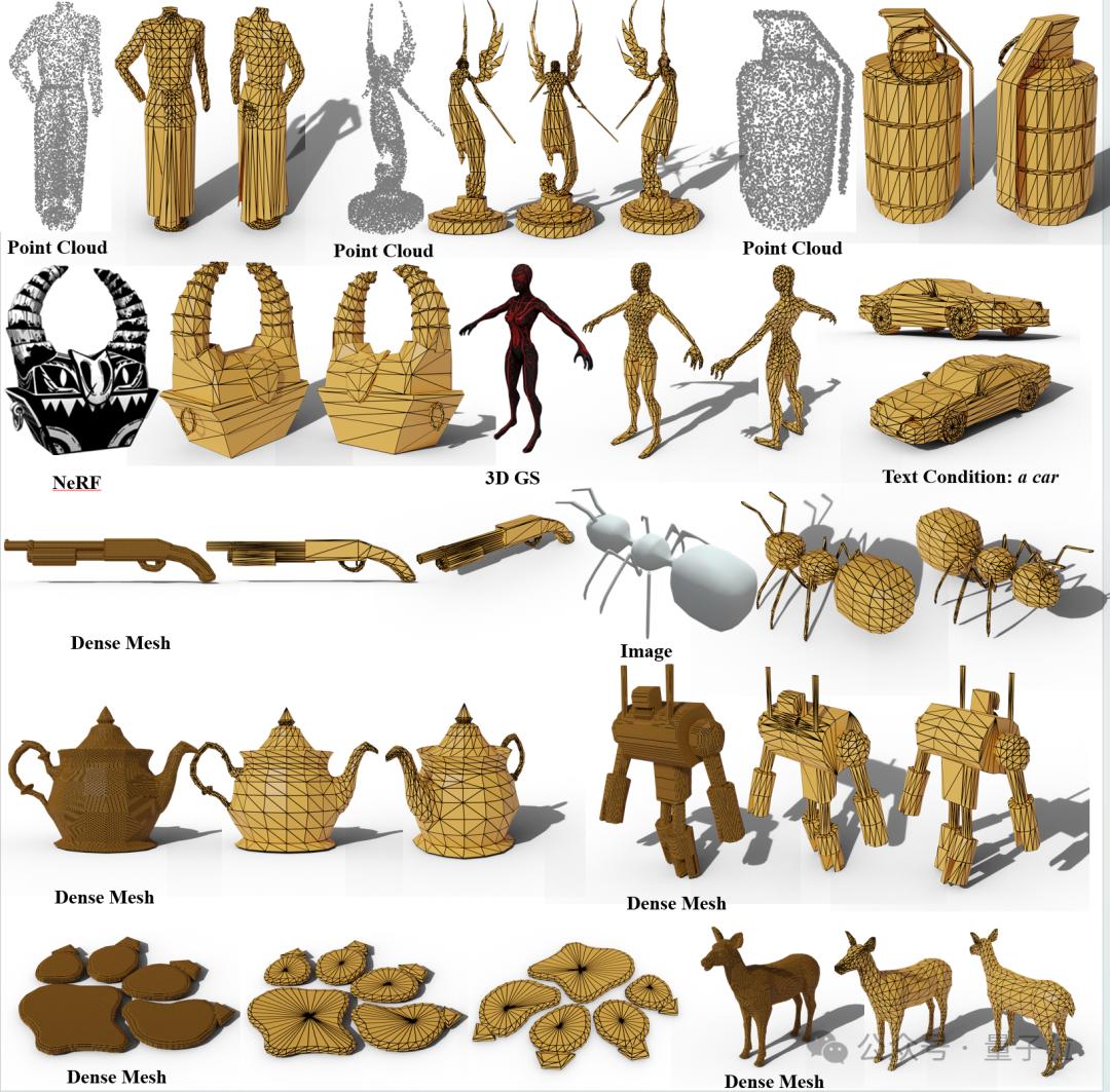 这些种类繁多的方法最终得到的3D表示虽然多样,但总能从中采样到点云,从而输入到MeshAnything中转为人造Mesh,帮助这些能输出3D模型的工作运用到实际3D工业中。
