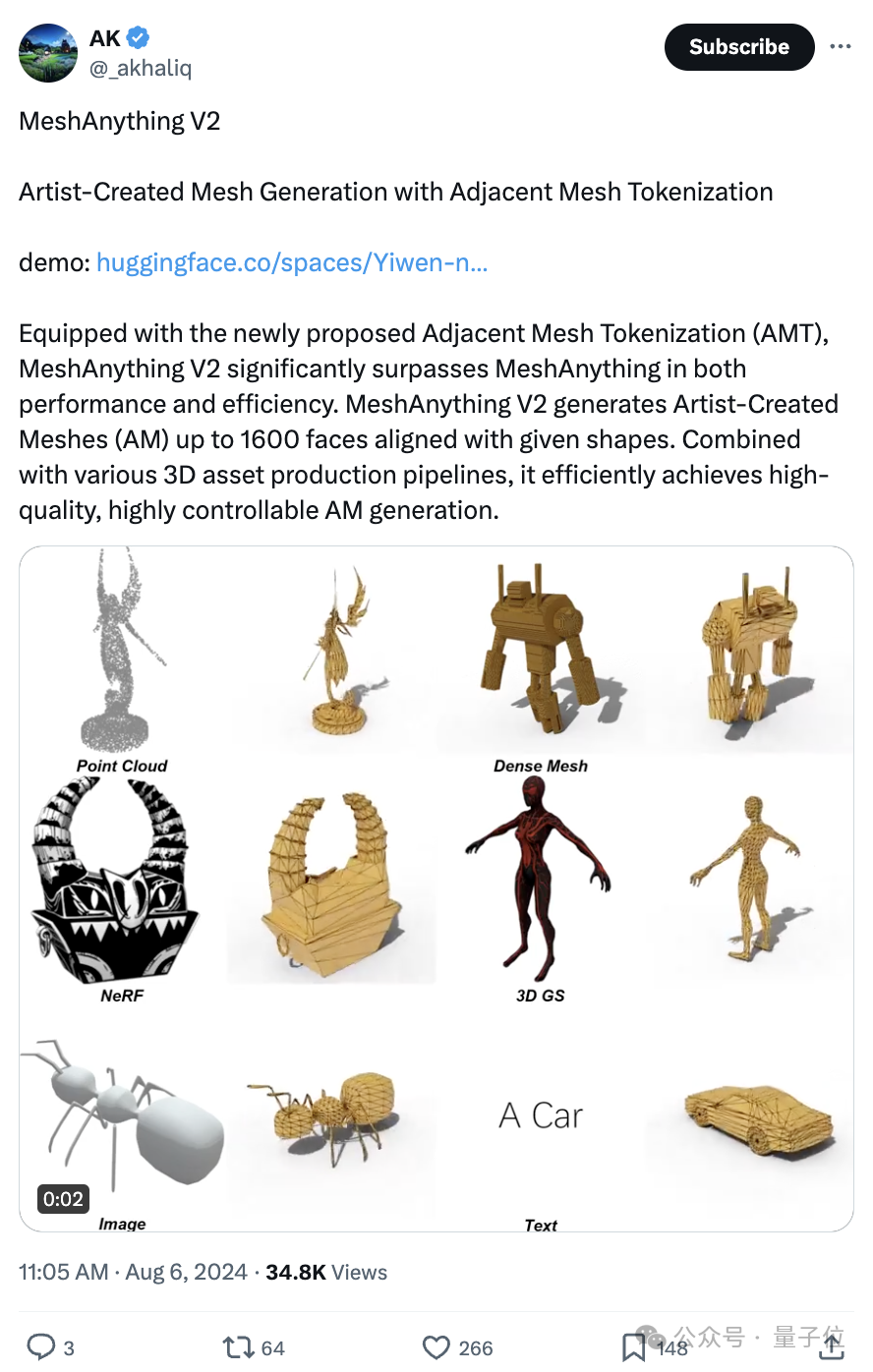 GitHub已揽星1.9k的MeshAnything项目上新了V2版本,由来自南洋理工大学、清华大学、帝国理工学院、西湖大学等研究人员完成。