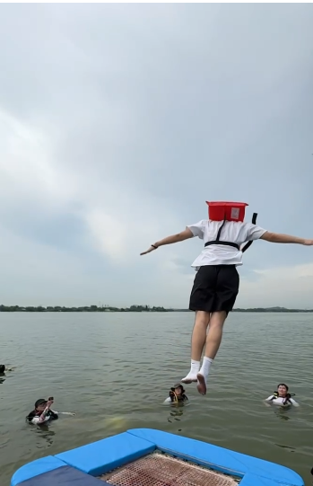 今年爱整活的人不在少数,大学生背着气球玩偶往湖里跳,周边围观人群拿着手机一顿拍。