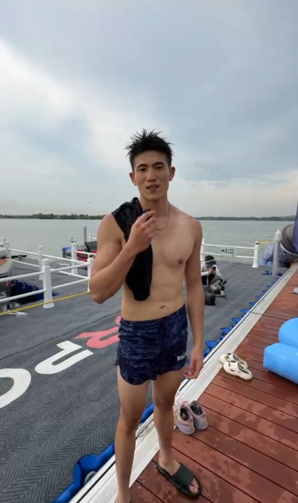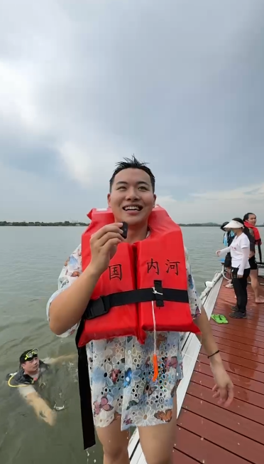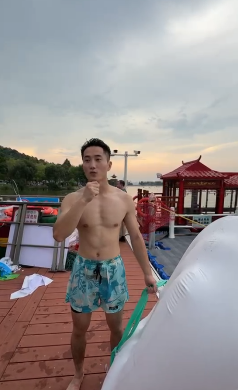 还有一位台湾小哥从重庆来武汉跳东湖,还提前半年准备,每天做600次卷腹给上半身塑形。这是他第一次跳有点紧张,还准备了游泳圈。董先生称,自己两年前就知道跳东湖这个活动了,这次到了现场感觉很棒。