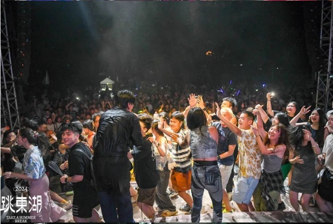 随着夜幕降临,舞台逐渐火热起来,灯光、彩雾、旗子让音乐节的氛围拉满。音乐被节奏撞碎成粒子四散,鲜活沸腾的感染力,随机感染现场摇摆的观众。不少网友在社交平台表示,跳东湖来得真值,下次还来!