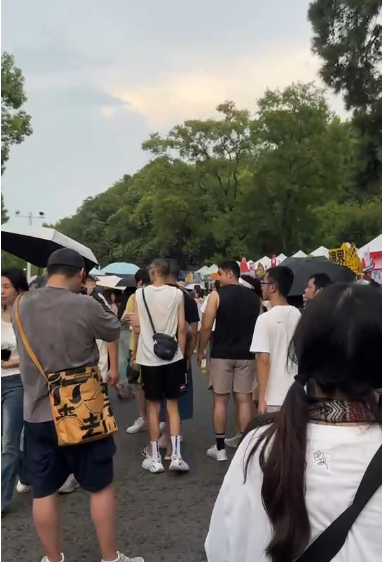 8月10日,九派新闻记者也来到了跳东湖现场。还没到活动正式开始的时间,活动摊位前已经挤满了人,摊主们松弛感十足,有的坐在露营椅上沉醉独酌,有的三三两两和路人闲聊。草地上随意走两步就有人即兴蹦迪,目之所及,仿佛时尚秀场。