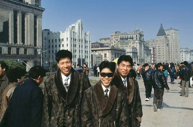当时的时代精神深深感染着他。有一张照片,拍摄到一位年轻人看到股票交易信息上涨的时候,高高举起了拳头。在外滩,凡德·休斯特遇到了三位年轻人穿着皮衣,其中一位戴着墨镜的年轻人用英语自豪地介绍说:“你知道吗先生?这是我们自己设计剪裁的西装和皮草。”在天津路的街角边,两位男士穿着西服套装,踌躇满志的样子,就像是港台电视剧中成功的商人。