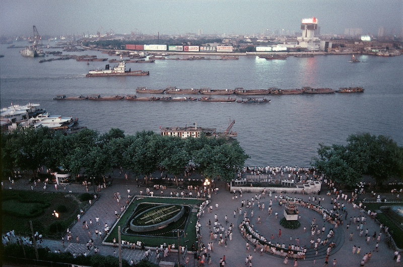 城市面貌的变化,无疑是最广泛的公共记忆。当凡德·休斯特第一次躺在和平饭店的套房里,听到黄浦江上的声声汽笛。第二天,他早早带着相机和三脚架出门。清晨六点,太阳慢慢升起,两个年轻的男子躺在外滩的防汛墙上,似乎是因为过于炎热而选择在江边纳凉并睡了一夜……外滩边散步、晨练、跳舞、休息的市民,也让他觉得分外有趣。眺望对岸,陆家嘴几乎是片平地,东方明珠刚刚破土而出,正节节攀升,杨浦大桥的桥身已具雏形。