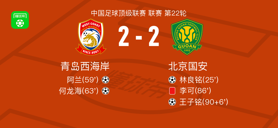 北京时间8月11日青岛西海岸vs北京国安,何龙海得到全场最高的8.6分,李可得到全场最低的6.0分