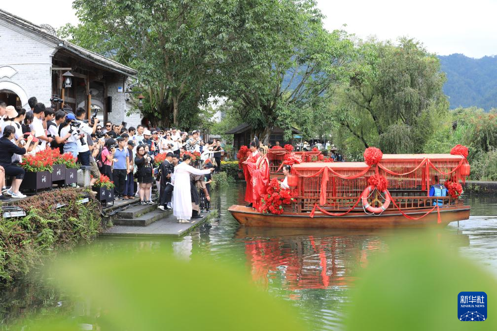 8月11日,人们在云南省腾冲市和顺古镇参观汉服婚礼表演。