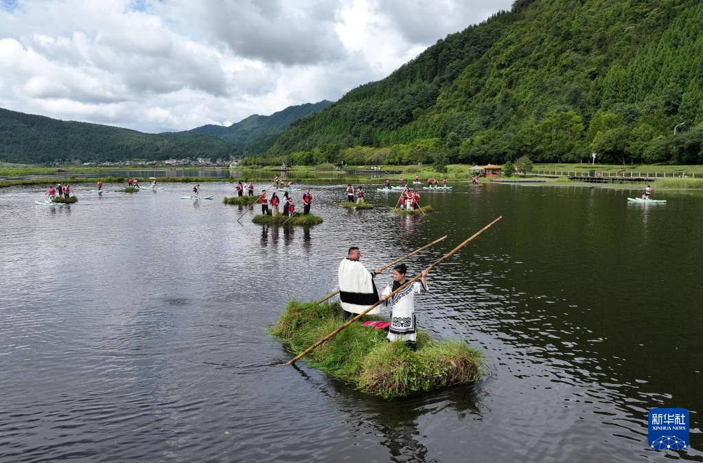 8月11日,人们在云南省腾冲市北海湿地公园划草排(无人机照片)。