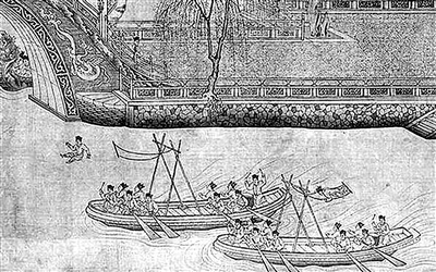 在每年3月20日左右,宋徽宗赵佶会带着自己的家人和大臣,前往金明池内的临水殿观龙船争标,“又有两画船,上立秋千,船尾百戏人上竿,左右军院虞侯监教鼓笛相和,又一人上蹴秋千,将架(荡)平,筋斗掷身入水,谓之水秋千。”