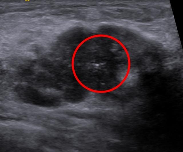 超声所见:右乳低回声结节,形态不规则,边界不清,边缘成角,呈“蟹足样”改变,可见多个微钙化。