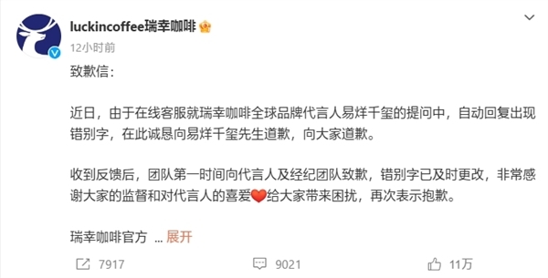 快科技8月12日消息,昨晚瑞幸咖啡官微发文向瑞幸全球品牌代言人易烊千玺道歉。