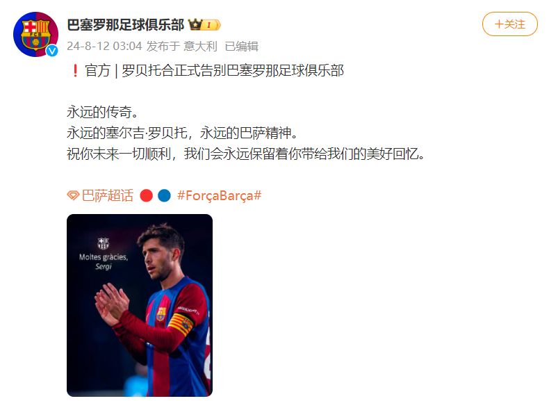 8月12日,巴塞罗那足球俱乐部官宣罗贝托正式告别。