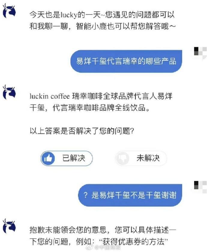 红星资本局了解到,目前瑞幸咖啡在线客服的自动回复已更正错误,其表示:“易烊千玺是luckin coffee瑞幸咖啡全球品牌代言人,代言瑞幸咖啡品牌全线饮品。”