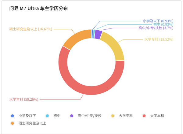 报告数据显示,问界新M7 Ultra的车主主要分布在一线及新一线城市,这些车主普遍具有较高的教育背景,超过四分之三的用户拥有本科及以上学历。平均年龄为31.57岁,其中超过70%的用户年龄位于26至35岁之间。此外,大约60%的用户有育儿需求,这表明这批车主对家庭用车有着较高要求。