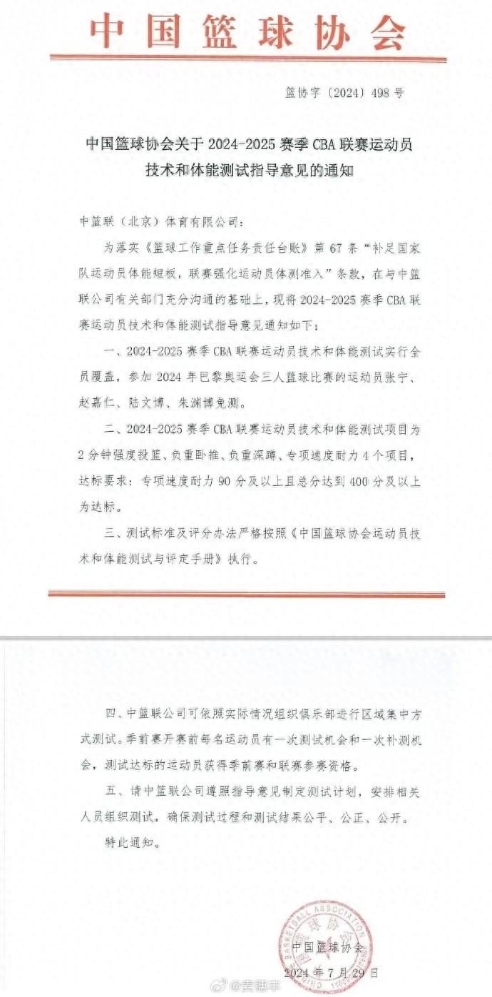8月12日,据媒体人麦穗丰消息,中国篮协近日发布2024-25赛季CBA体测指导意见,官宣新赛季CBA将进行全员季前体测。具体测试项目为2分钟强度投篮、负重卧推、负重深蹲和专项速度耐力四项。