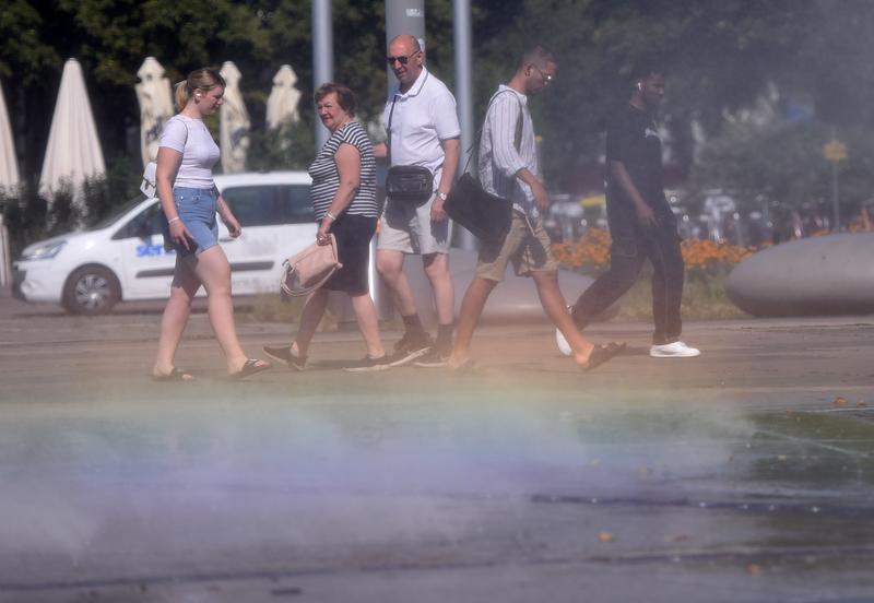 7月16日,人们从奥地利首都维也纳一处喷雾装置旁经过。 近日,奥地利首都维也纳迎来高温天气。 新华社记者 贺灿铃 摄