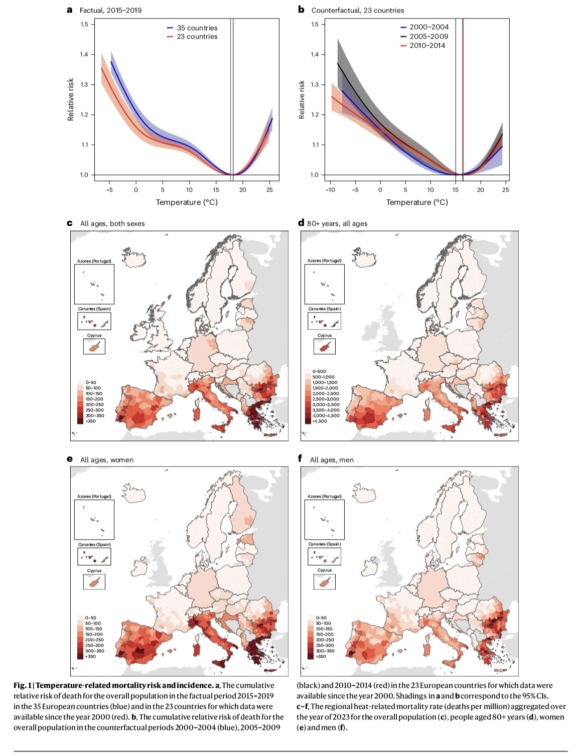温度相关的死亡风险和发生率。a. 2015-2019年35个欧洲国家(蓝色)和2000年以来有数据的23个国家(红色)的整体人群死亡相对风险的累积图;b. 2000-2004年(蓝色)、2005-2009年(黑色)和2010-2014年(红色)23个欧洲国家的整体人群死亡相对风险的累积图;c. 2023年全年整体人群的区域热相关死亡率(每百万人死亡人数)的聚合图;d. 2023年全年80岁及以上人群的区域热相关死亡率的聚合图;e. 2023年全年女性的区域热相关死亡率的聚合图;f. 2023年全年男性的区域热相关死亡率的聚合图。