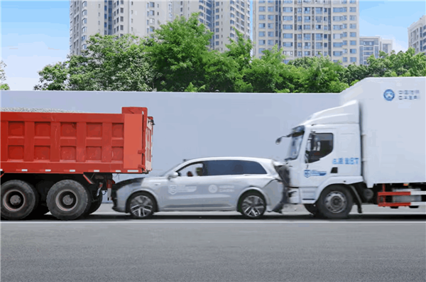 据介绍,理想L9后方一辆8吨重卡高速追尾理想L9,该试验模拟乘用车随重型自卸车行驶时受到后方重型卡车追尾并前后夹击的工况。