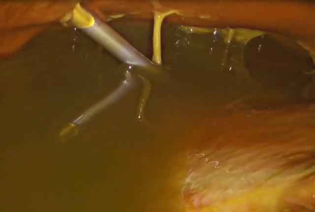 经过充足的术前讨论和准备后,手术于8月2日进行。腹腔镜一进入患者腹内,满眼都是绿色的胆汁,不仅肝脏、肠道充血、水肿严重,肝、肠、胃这些腹腔脏器表面全都长满“青苔”(胆汁脓液附着物)。