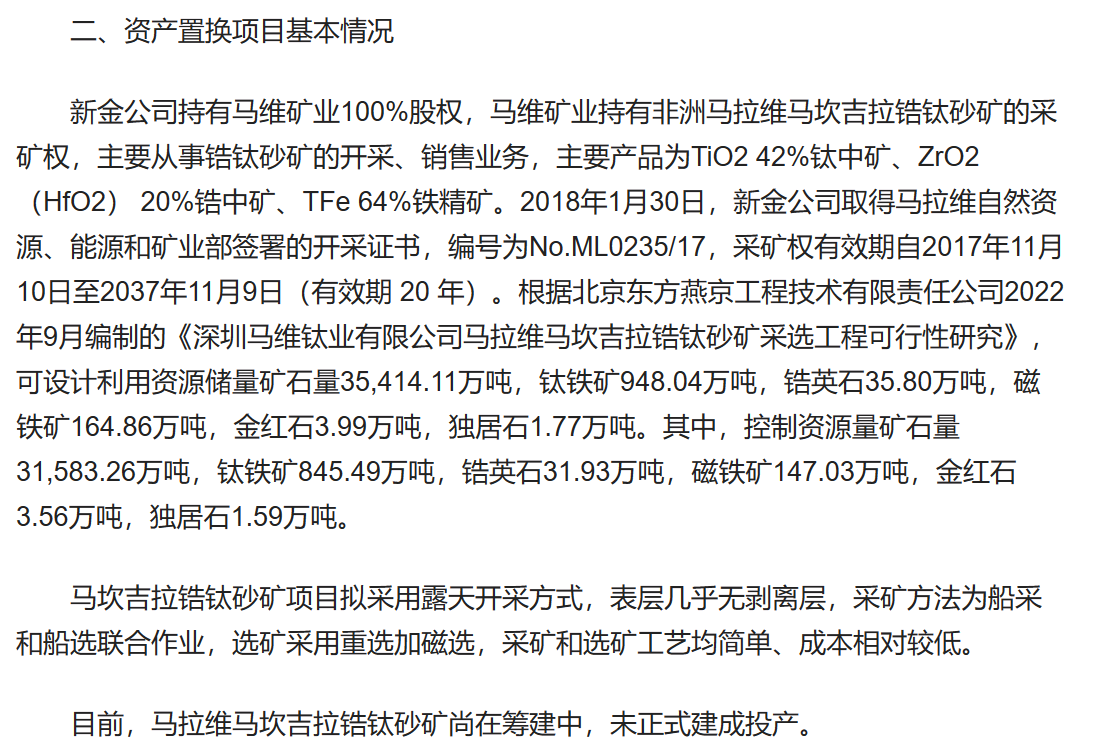 目前,*ST中润从房地产公司变更为纯矿业公司,新控股子公司新金公司唯一的资产是非洲国家马拉维的马坎吉拉锆钛砂矿采矿权,不过目前该矿还处于筹建期。