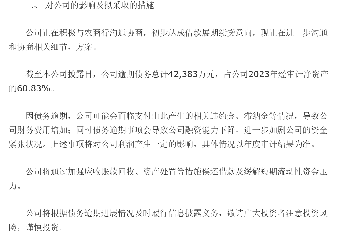 公告同时提及,因债务逾期,公司可能会面临支付由此产生的相关违约金、滞纳金等情况,导致公司财务费用增加;同时债务逾期事项会导致公司融资能力下降,进一步加剧公司的资金紧张状况。
