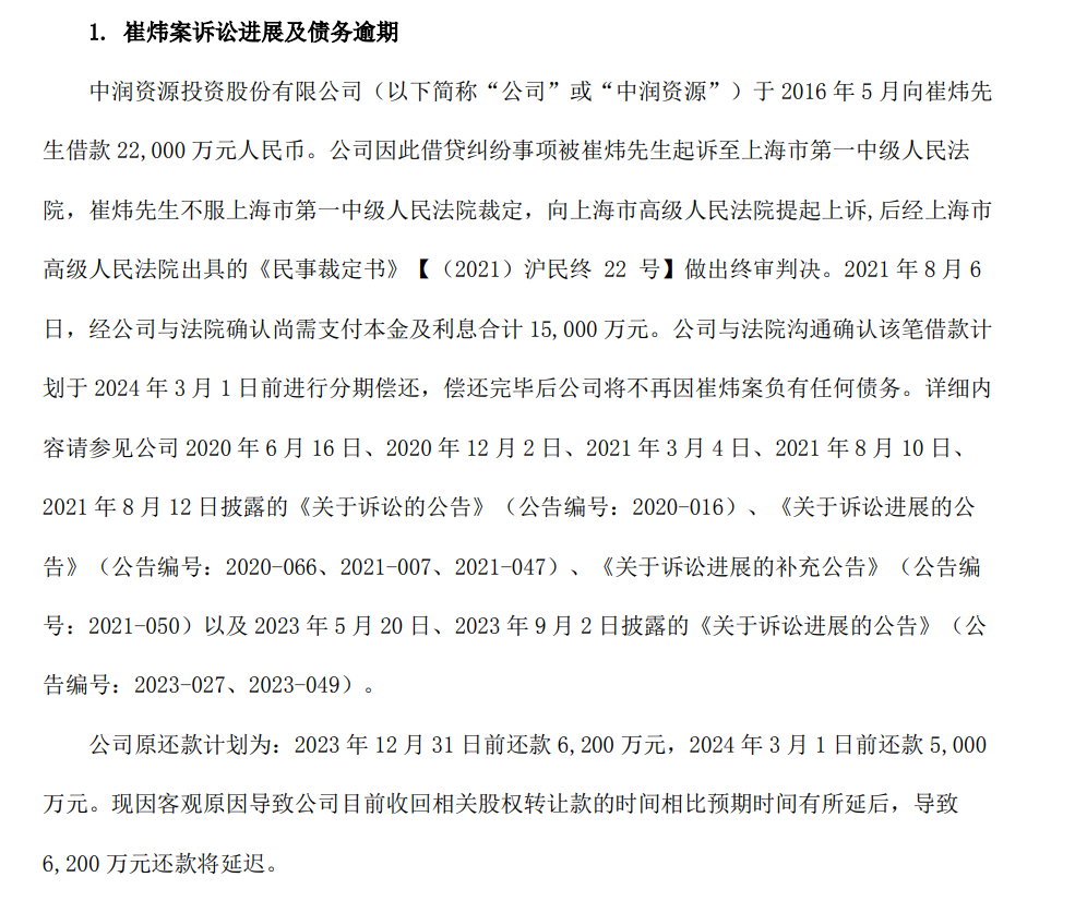 *ST中润逾期债务问题较为严重,且由来已久。截至2024年第一季度,中润资源的资产负债率为44.05%。2024年5月15日,中润资源发布借贷诉讼的进展公告,涉及崔炜案诉讼中向崔炜先生借款的22,000万元人民币,承诺分两次还款,最迟于2024年3月1日前还款,但截至目前仍处于逾期状态。除此之外,还存在银行贷款逾期的情况。