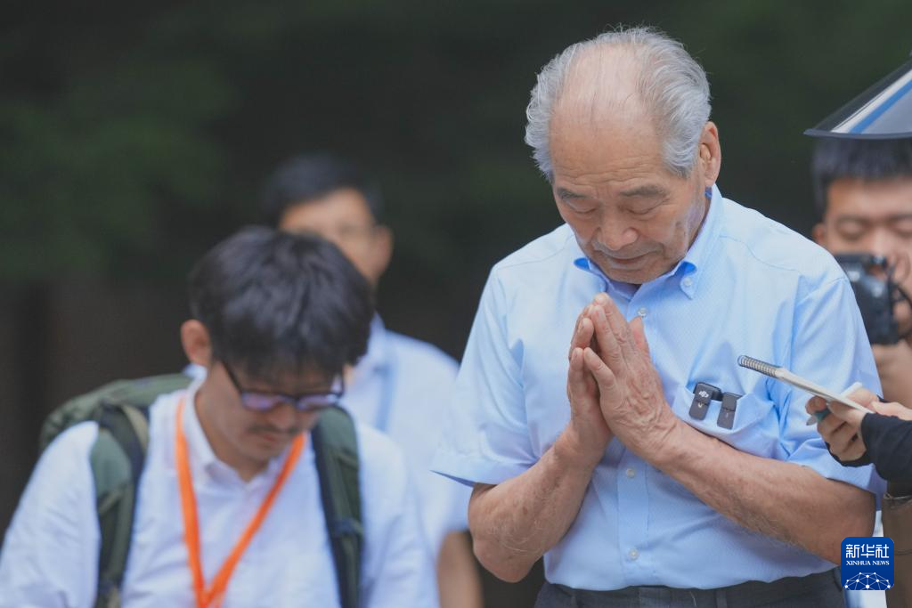 8月13日,侵华日军第七三一部队“少年队”原队员清水英男(前左二)在侵华日军第七三一部队旧址指认侵华日军细菌战罪行时双手合十。