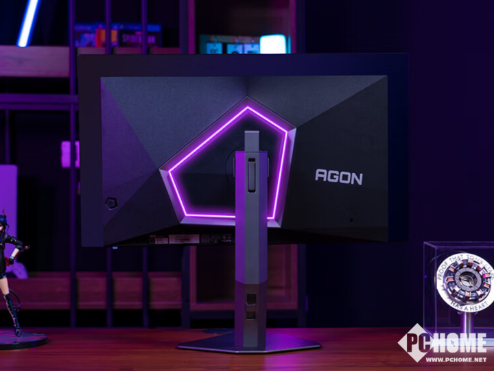 设计上,AGON AG276QZD2引入了全新的几何美学设计,采用了四边微边框,后壳的多边形线条层次分明与五边形的氛围灯效结合,支持Light FX灯光系统,使其未来科技感,让玩家沉浸在电竞氛围中。由于OLED面板既不需要背光模组也不需要液晶层,组件更少,这让AGON AG276QZD2相比一般的显示器有着更为纤薄的机身。搭配的支架加入了收纳理线夹设计和便携手折叠耳机挂架,多边形底座占用更少的桌面空间,人性化的细微设计为玩家提供更为舒适的游戏体验。
