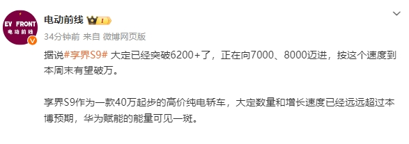 在新能源汽车市场日益激烈的竞争中,一款新车的市场表现往往能迅速成为行业关注的焦点。近日,享界S9凭借其卓越的性能、豪华的配置以及华为的深度赋能,在上市后的短时间内便引发了市场的强烈反响,预订量持续攀升,成为了业内瞩目的焦点。