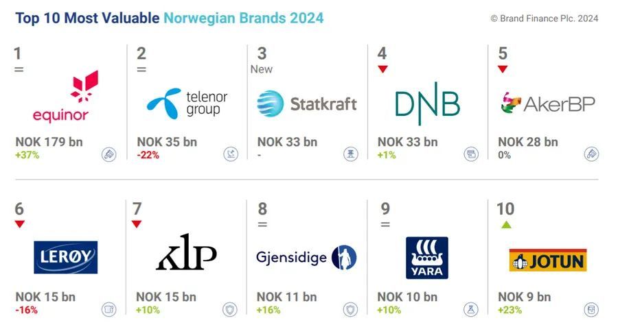英国品牌评估机构“品牌金融”(Brand Finance)发布 “2024挪威品牌价值25强”排行榜(Norway 25 2024)。挪威国家石油、挪威电信、挪威国家电力名列前三名。