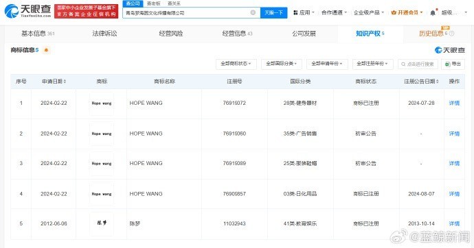 天眼查App显示,青岛梦海圆文化传播有限公司已成功注册1枚“陈梦”商标,国际分类为教育娱乐。近期,该公司申请的健身器材、日化用品类“HOPE WANG”商标已成功注册。