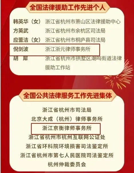 在法律援助领域,西湖律师同样表现出色。3月18日,司法部表彰全国法律援助和公共法律服务工作先进集体、先进个人,西湖律所及律师榜上有名,其中,浙江京衡律师事务所荣获“全国公共法律服务工作先进集体”,浙江浙元律师事务所倪剑波律师荣获“全国法律援助工作先进个人”。