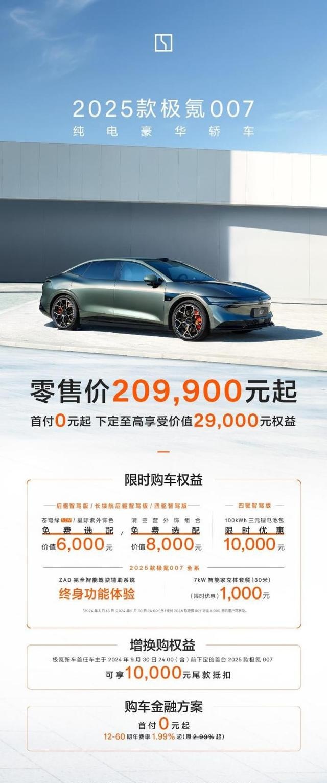 2025款极氪007购车权益:2024年8月13日到2024年9月30日24:00(含)支付定金5000元的用户可享限时购车权益;极氪新车首任车主,于2024年9月 30日24:00(含)前下定的首台2025款极氪007可享10000元尾款抵扣。