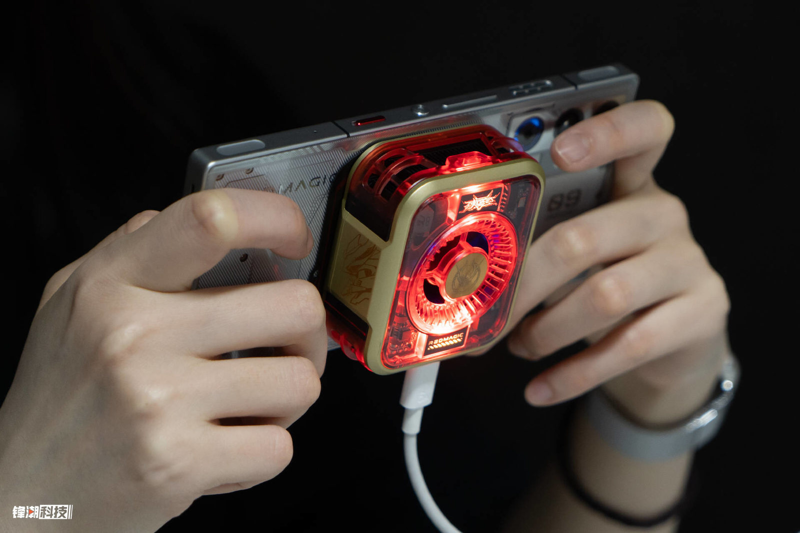 在启动之后,这款定制版本的红魔散热器 5 Pro 还会亮起 RGB 角色灯效,让原本就科技感十足的机身变得更加炫酷。当然,使用红魔的头号玩家 App 与它进行连接后,用户也能对它的灯效进行自定义,展现自己的个性审美。