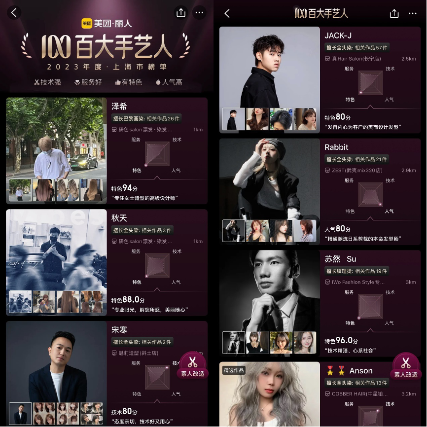 据美团调研数据,约72%的消费者会因为手艺人选择一家店。为了帮助消费者找到更合适的手艺人,今年5月,美团丽人在上海试点推出了年度百大手艺人榜单,综合技术、服务、特色和人气四大维度,精选出63名“宝藏发型师”。