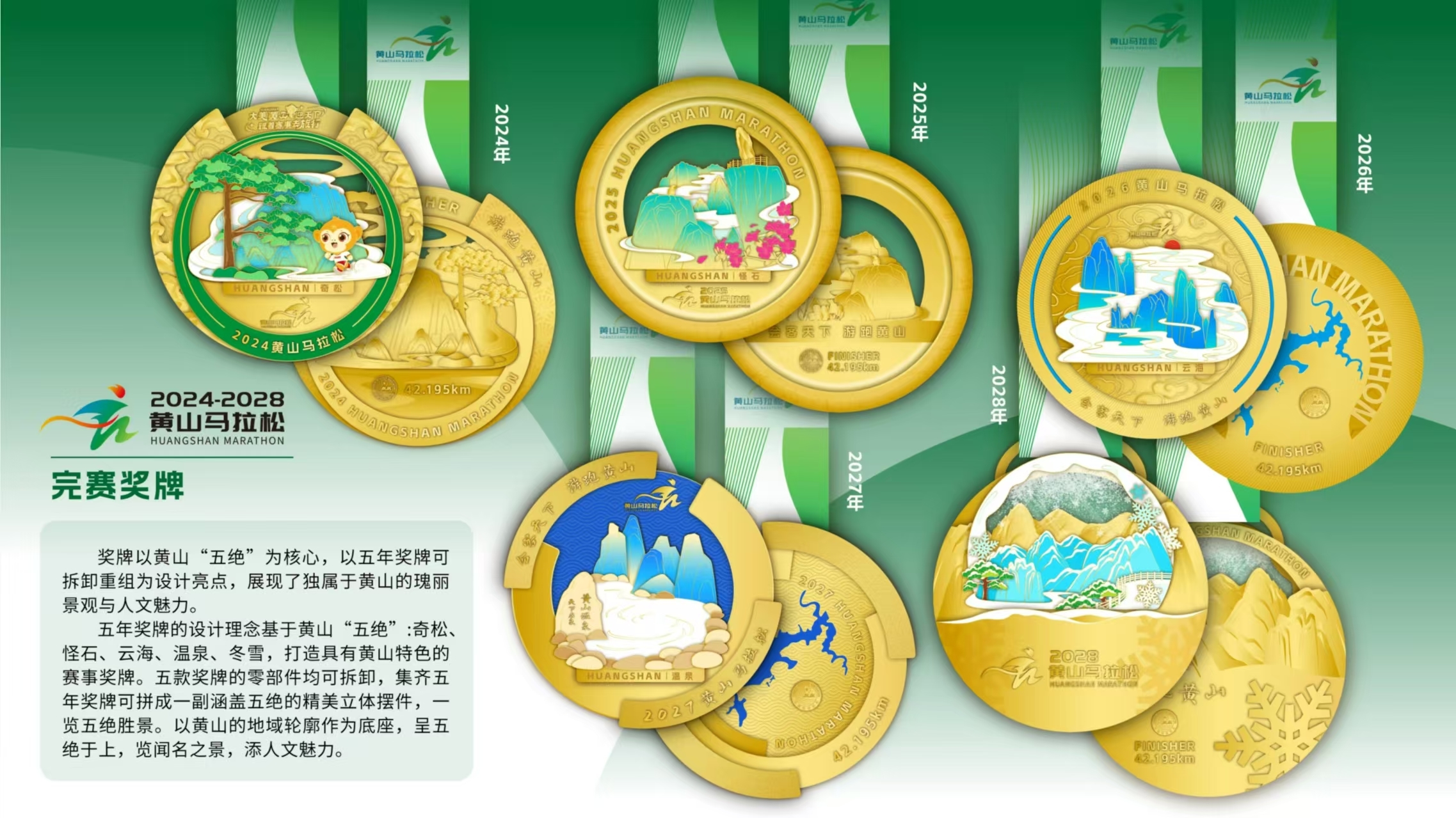 比赛还将推出五年系列完赛奖牌,以黄山五绝“奇松、怪石、云海、温泉、冬雪”为核心元素,以五年奖牌可拆卸重组为设计亮点,展现黄山的瑰丽景观和人文魅力,打造出具有黄山特色的赛事奖牌。其中,2024黄马奖牌,正面以“奇松”为设计主题,外观上融合“零碳”概念,以绿色为主色调,以松针为底纹,契合主题的同时增添美感与设计感。