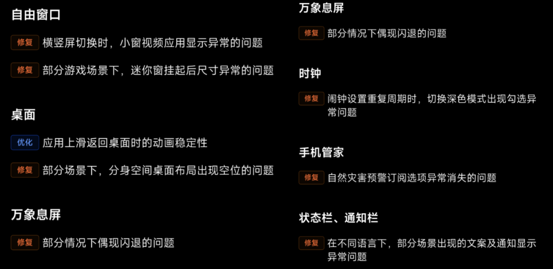 除此之外还有一些细节上的更新,对自由窗口、桌面、息屏、时钟、手机管家、状态栏、通知栏的一些 bug 进行了修复。