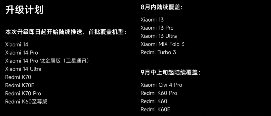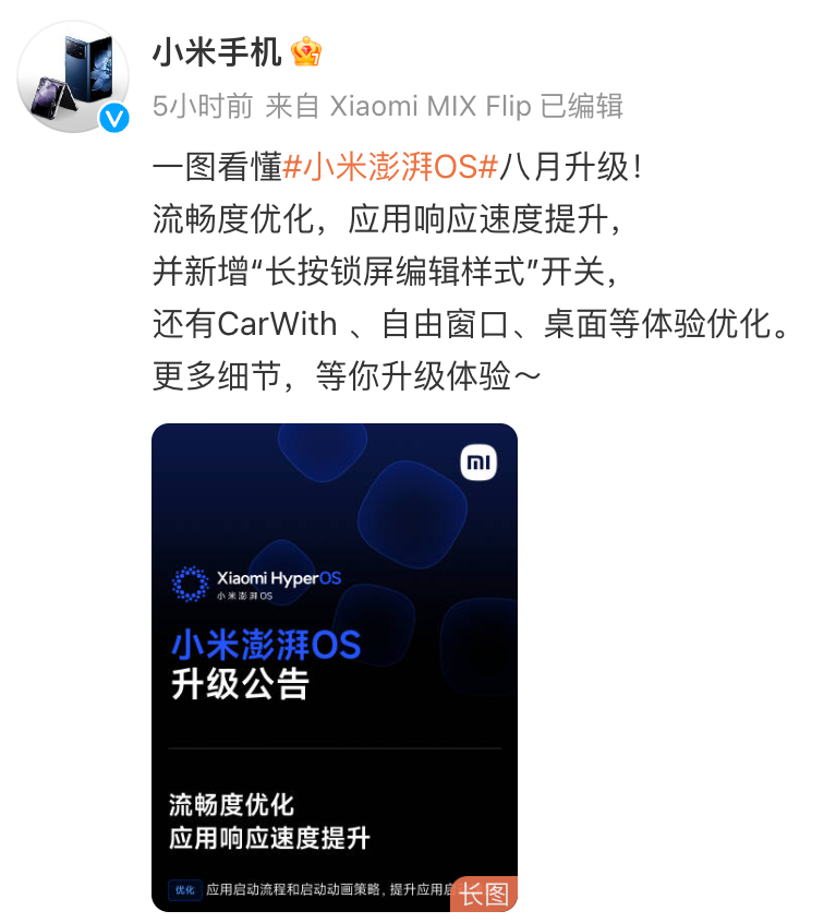 上午,小米手机官方微博正式宣布部分机型将迎来「小米澎湃 OS 八月升级」。