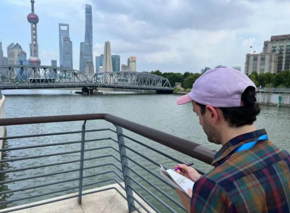 美国漫画家丹·诺特在苏州河畔掏出速写本。安哥拉作家阿瓜卢萨对上图东馆赞不绝口,他形容这座造型独特的图书馆如同森林中的宝藏,“能把书籍和森林、知识和自然联系在一起,这样的城市文化设施让人感到幸福。”法国作家加尔桑自从1994年首次访沪,过去30年里他屡次游历上海,他对上海充满烟火气的市民生活是熟悉的,从长白228街坊回到外白渡桥边,他感叹:“虽然我的作品在今年才翻译成中文,但我和这里的渊源是很深的,在某种程度上,我也是见证了上海在30年里怎样变成现在这座璀璨的城市。”