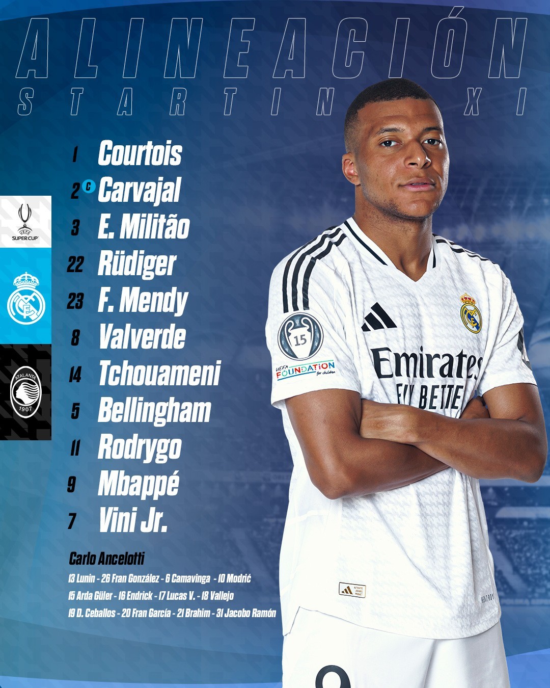 皇家马德里官方公布了欧洲超级杯对阵亚特兰大的首发阵容,姆巴佩名列其中。