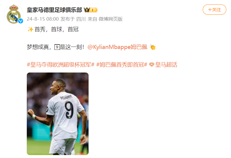皇马官方发文为姆巴佩俱乐部首球庆祝:首秀,首球,首冠!梦想成真,“9”是这一刻!