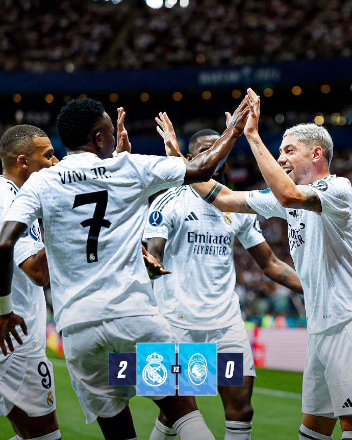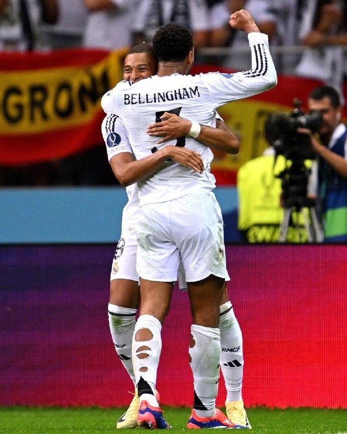 第59分钟,威尼修斯助攻巴尔韦德推空门得手打破僵局;第68分钟,贝林厄姆助攻姆巴佩推射得分达成首秀破门,最终2比0战胜对手,收获队史第6座欧超杯!